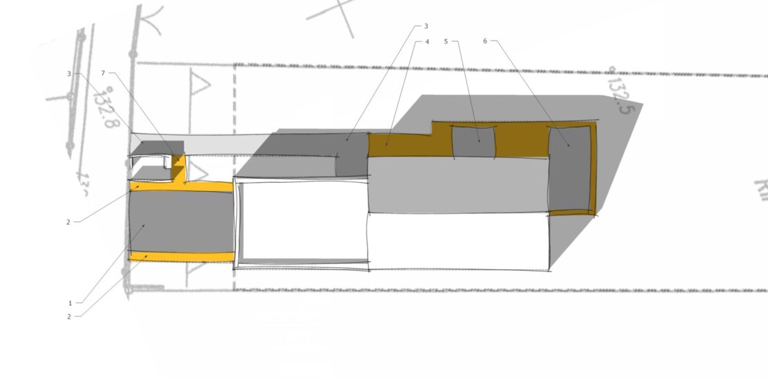 Projekt strefowania terenu za pomocą różnych rodzajów, faktur i kolorów kostki brukowej.