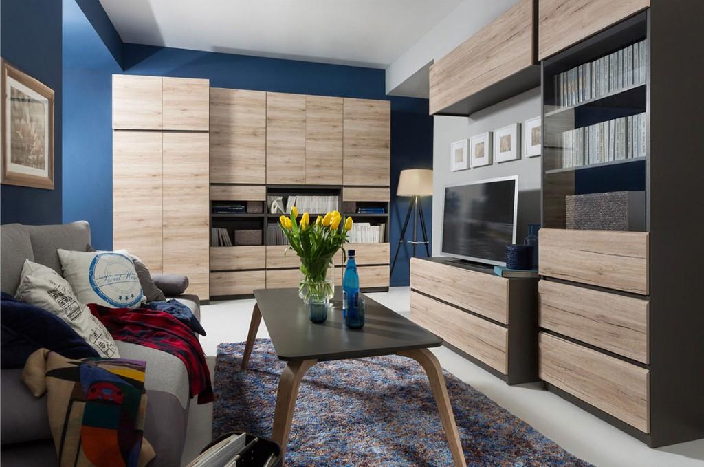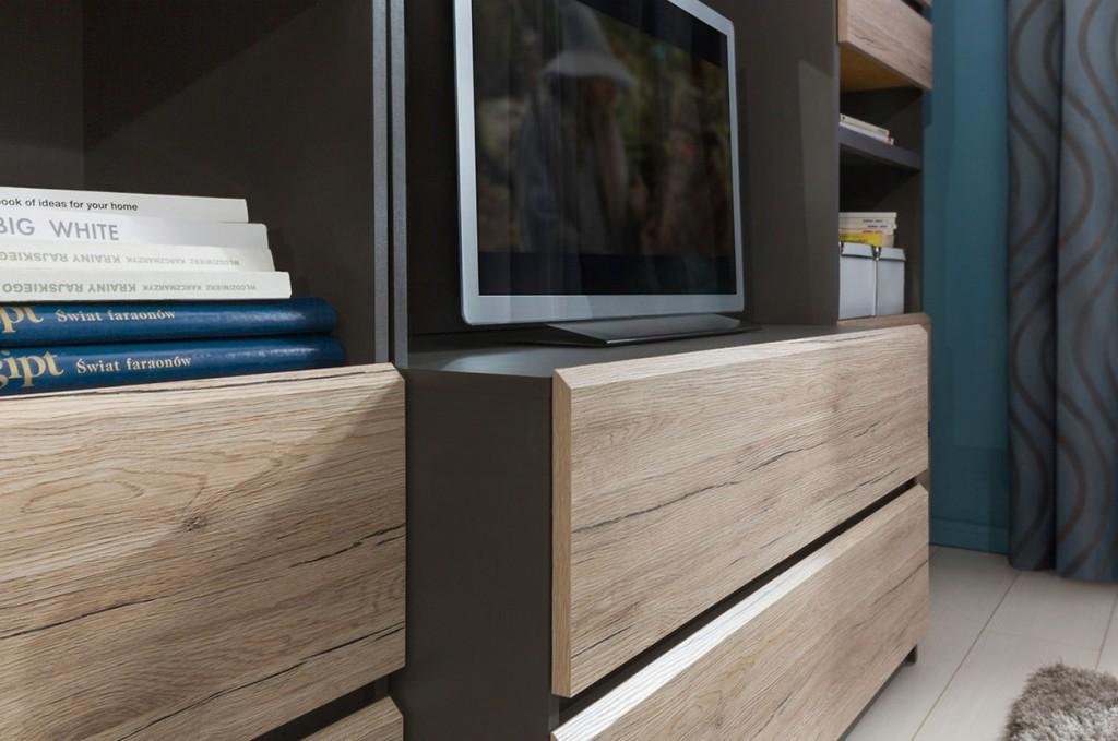 Minimalistyczny styl kolekcji sprawia, że geometryczne formy oraz nowoczesne bezuchwytowe fronty, doskonale korespondują z pięknymi poziomymi rysami słojów. System Moden składa się z 14 elementów. Korpusy mebli dostępne są w kolorze szary wolfram, natomiast fronty dostępne są w 2 wybarwieniach: dąb san remo jasny oraz orzech kolumbia.