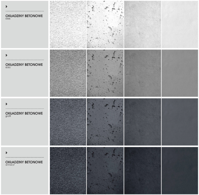 Dostępna technologia pozwala odpowiedzieć na indywidualne potrzeby projektantów. Do wyboru mamy liczne rodzaje wykończenia, od niemal lustrzanej gładkości przez płaszczyzny matowe czy rowkowane, aż do odciśniętych w betonie skomplikowanych wzorów. Można je zresztą dowolnie ze sobą zestawiać. Jednakowy kolor i wykończenie powierzchni ograniczane tylko i wyłącznie kreatywnością projektanta.