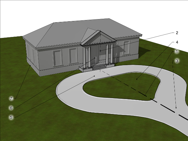 trawnik otoczony drogą dojazdową kończącą się bezpośrednio przed wejściem do rezydencji. Tak