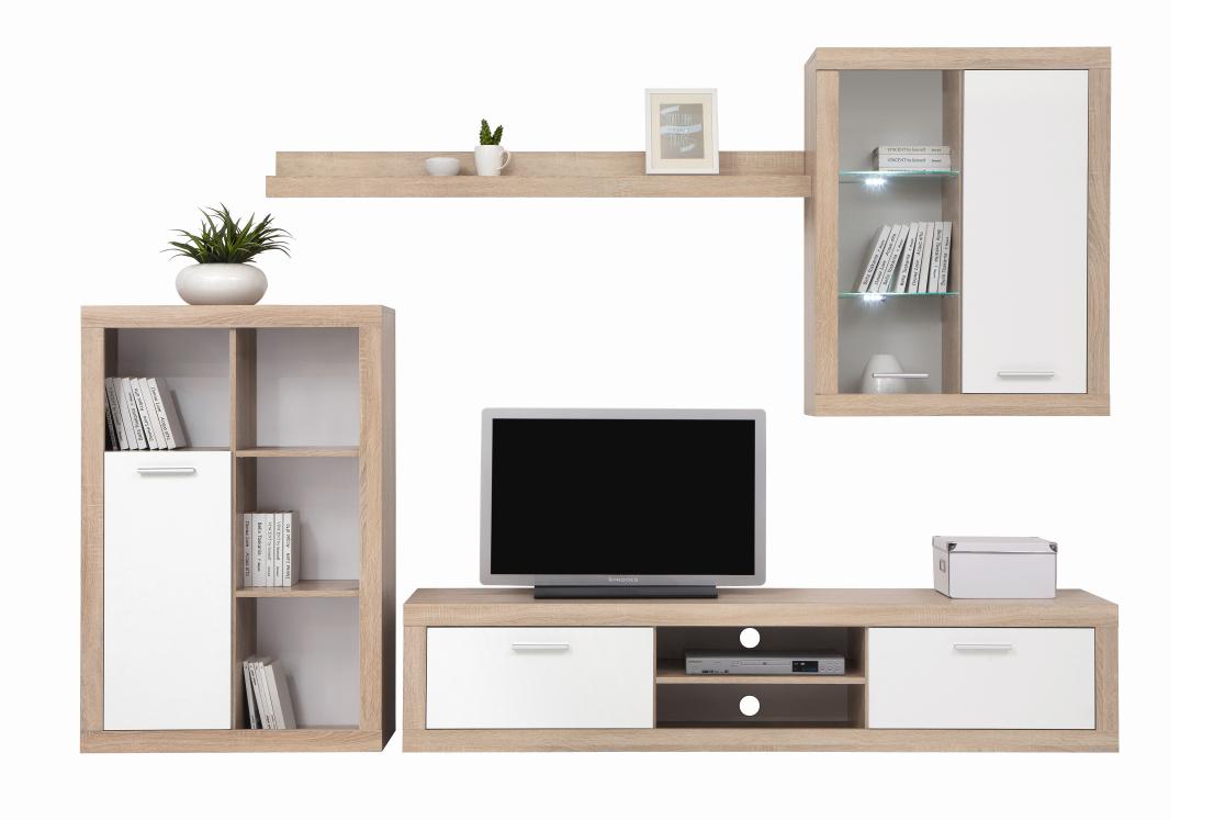 Miłośników uniwersalnego stylu z pewnością zainteresuje meblościanka Shark. Kompaktowy zestaw składa się z 4 elementów, które dają swobodę aranżacji niedużego pokoju. Szafkę rtv i regał można ustawić w dowolny sposób, a witrynę oraz półkę zawiesić na wybranej wysokości. Aby meble posłużyły jak najdłużej, drzwiczki oraz szuflady zostały pokryte białym laminatem o podwyższonej odporności na uszkodzenia.