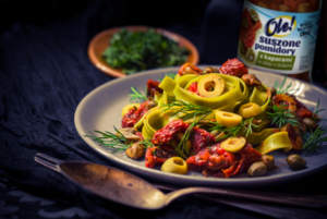 Suszone pomidory w paskach i kapary w oleju z ziołami OLE! to właściwie wszystkie potrzebne składniki Twojego obiadu Jeśli masz w domu makaron penne, możesz zabrać się za przygotowanie przepysznego dania. Jeśli aromatyczną zalewę ze słoika potraktujemy jako sos i podgrzejemy na patelni wraz z pozostałą jego zawartością, pozostaje tylko dodać zagotowany makaron penne i voila! – można już zasiadać do stołu. To jeden z najbardziej błyskawicznych przepisów na sycący posiłek, którym możesz z powodzeniem poczęstować znajomych lub rodzinę, nawet jeśli wpadli do Ciebie bez zapowiedzi. To równie dobry pomysł na zwykły codzienny posiłek lub późną kolację, jeśli nie chcesz zbyt wiele czasu spędzać w kuchni. Penne z suszonymi pomidorami można oczywiście wzbogacać wieloma dodatkami, takimi jak starty ser mozzarella lub ementaler, czosnek lub listki bazylii. Zawsze jednak pozostanie ono charakterystycznie włoskim daniem, które rozpieści podniebienia miłośników aromatycznych ziołowych dań. Wiosną chcemy cieszyć się każdą chwilą słońca i dlatego szkoda tracić czas na pracochłonne przygotowywanie posiłków. Dzięki OLE! można spędzić czas przy stole (może już ogrodowym?), w gronie przyjaciół – po raz kolejny zaskoczonych naszą kulinarną inwencją!