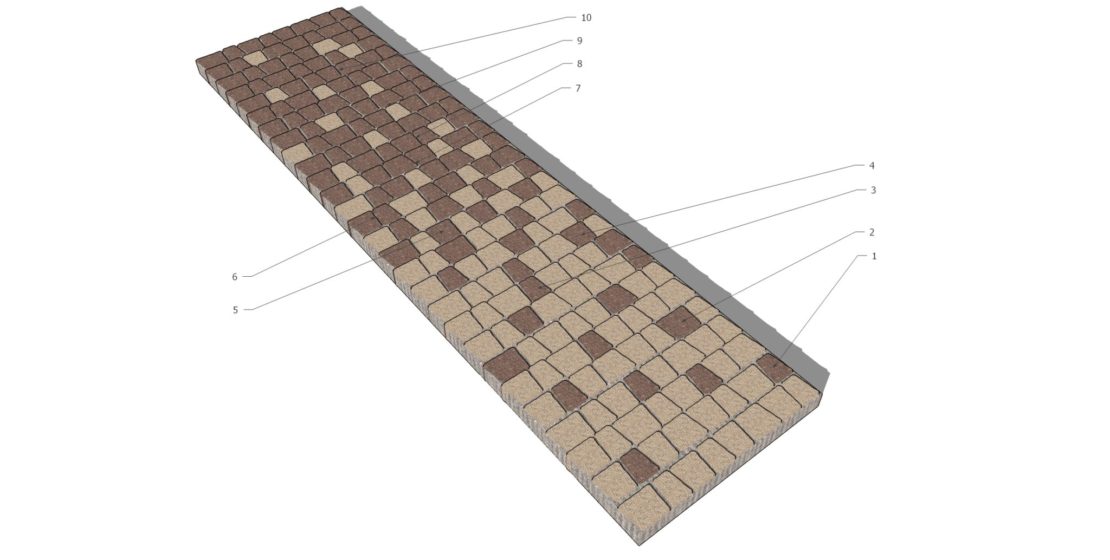 W zależności od szerokości układanej nawierzchni mogą pojawić się wartości odległości między kostkami, przy których układ zacznie przypominać regularny wzór. W wypadku pasa o szerokości 8 elementów nastąpi to przy odstępie 3 kostek. Aby uniknąć denerwującego powtórzenia stosujemy więc tylko jeden rząd kostki w tym odstępie.