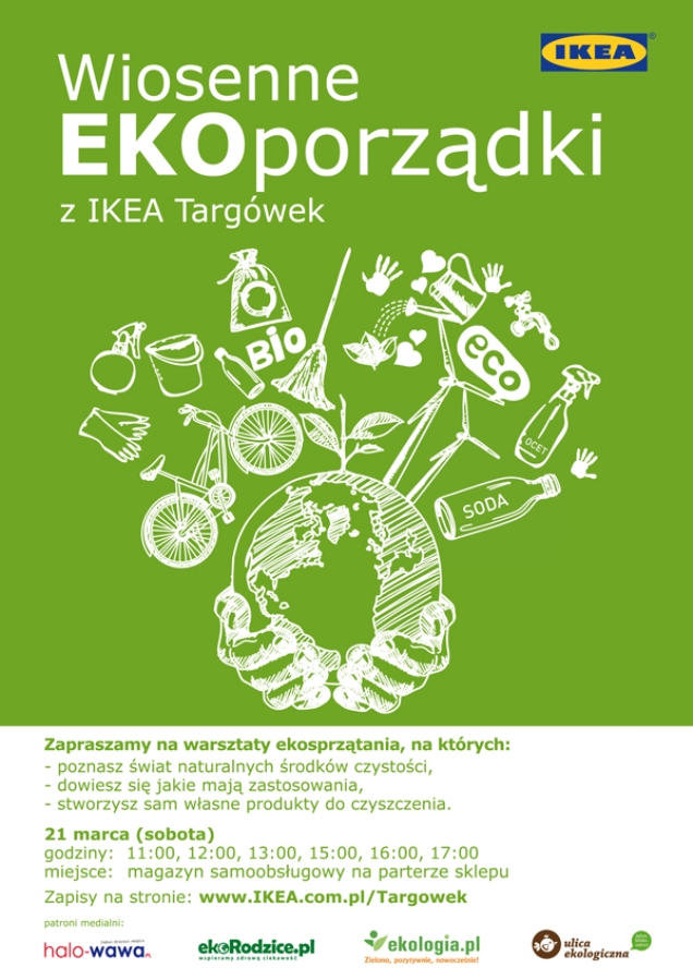 Wiosna to czas, kiedy wszyscy mają więcej ochoty do działania. Odświeżają, porządkują mieszkania, korzystając z różnych środków czystości. Aby skutecznie pozbyć się plam i kurzu wcale nie trzeba używać hektolitrów chemicznych płynów, wystarczy kilka naturalnych produktów, które znajdziemy w lodówce, czy w spiżarni. O tym właśnie będą mogły przekonać się osoby biorące udział w bezpłatnych warsztatach „Wiosenne EKOporządki”, które odbędą się 21 marca (sobota) w IKEA Targówek, w godzinach 11.00, 12.00, 13.00, 15.00, 16.00, 17.00. Podczas zajęć ekosprzątania uczestnicy zostaną wprowadzeni w świat naturalnych środków czystości. Dowiedzą się jakie organiczne składniki mogą wykorzystać podczas sprzątania oraz jakie właściwości mają te produkty. Będą także samodzielnie tworzyć mikstury do czyszczenia tj. naturalny odświeżacz powietrza, ekologiczny udrażniacz rur, czy uniwersalny płyn do wszystkich powierzchni. Warsztaty poprowadzi Magdalena Tokarska, ekspertka z dziedziny ekologii, autorka artykułów i publikacji dot. ekologii i zdrowego trybu życia.
