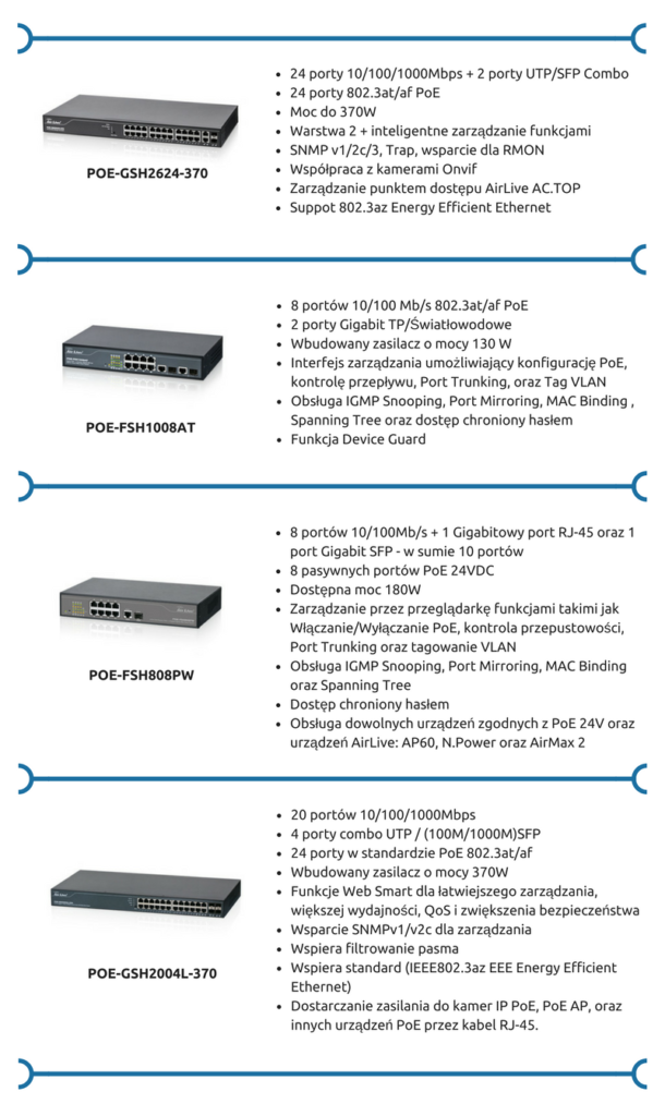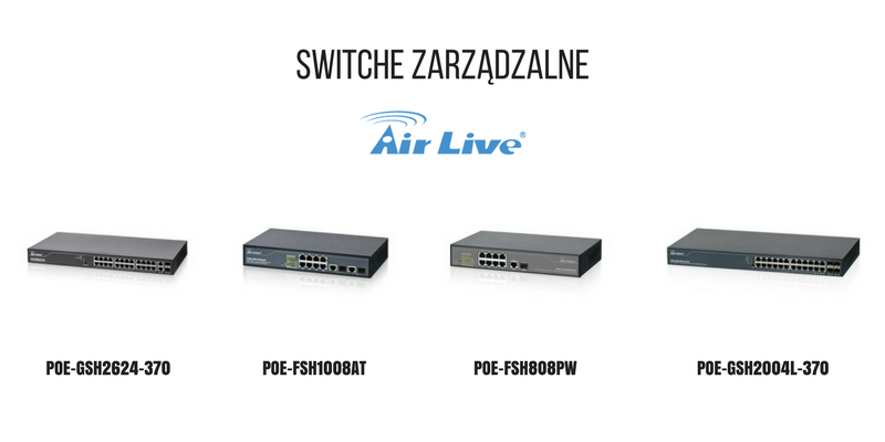 Airlive to marka specjalizująca się w rozwiązaniach sieciowych już od 23 lat. Jako doświadczony gracz na rynku, Airlive tworzy najlepsze rozwiązania bez kompromisów. Wysokiej klasy zasilacze, redundantne wejścia zasilania, funkcje device guard i wiele innych rozwiązań zapewnia stabilną i bezpieczną sieć. Rozwiązania do nadzoru sieci są wyposażone w funkcje Device Guard, która monitoruje funkcjonowanie urządzeń w sieci, a także jest w stanie zrestartować kamery IP, punkty dostępu i inne urządzenia jeśli kontakt z urządzeniem zostanie utracony co świadczyć będzie o jego nieprawidłowym działaniu. Rozwiązanie pomaga obniżyć koszty utrzymania i zaoszczędzić czas. Aktualnie firma Airlive oferuje switche w trzech kategoriach. Są to :