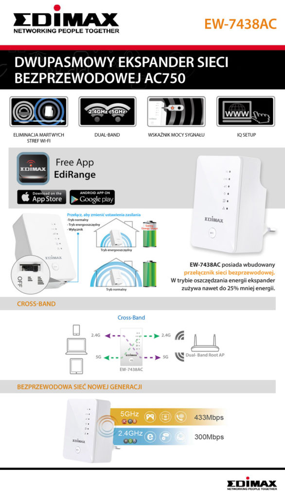 EW-7438AC to kompaktowy ekspander sieci bezprzewodowej. Jest łatwy w użyciu, eliminuje „martwe punkty” sieci bezprzewodowej i zwiększa jej pokrycie. iQ Setup pozwala na łatwą i szybką konfigurację jednego z trzech trybów pracy: punkt dostępu, ekspander lub most WiFi. A dzięki zgodności ze standardami 802.11ac i 802.11a/b/g/n ekspander zapewnia prędkość przesyłania danych jednocześnie do 300Mb/s w paśmie 2.4GHz i do 433Mb/s w paśmie 5GHz. EW-7438AC współpracuje z aplikacją na urządzenia mobilne, EdiRange, która umożliwia konfigurację urządzenia i udostępnia listę okolicznych sieci bezprzewodowych.