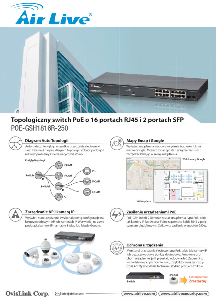 Firma Airlive przedstawia nowy switch o 16 portach RJ45 oraz 2 portach SFP. Switch posiada funkcję Diagramu Auto Topologii, Mapy Google i Emap, Zasilanie urządzeń PoE a także możliwość zarządzania punktami dostępu czy kamerą Ip – POE-GSH1816R-250.
