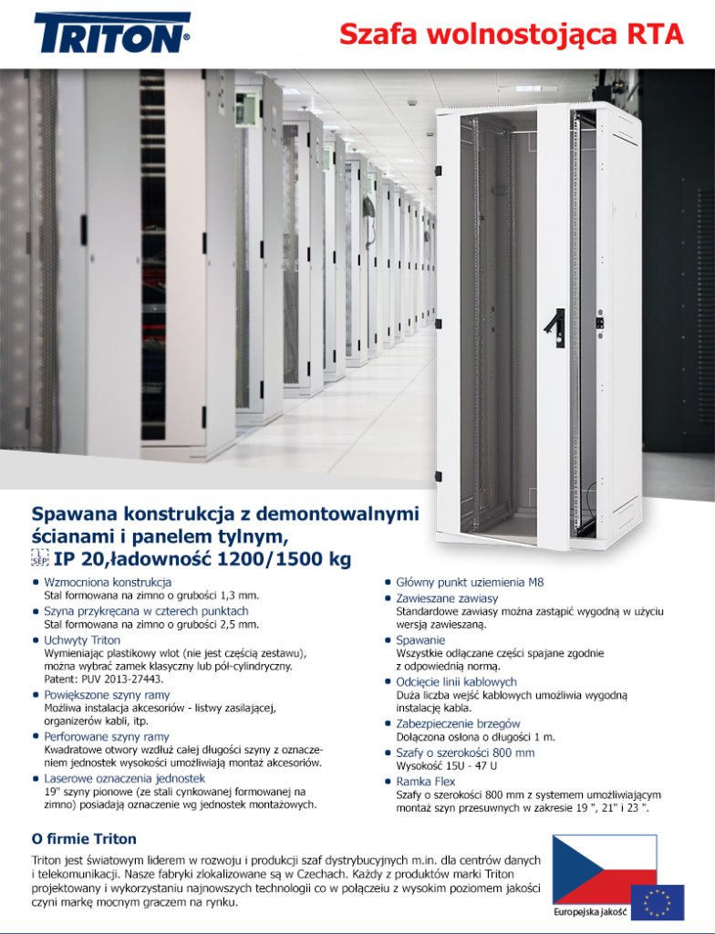 Szafa wolnostojąca RTA to spawana konstrukcja z demontowalnymi ścianami i panelem tylnym, IP 20, ładowność 1200/1500 kg. Grubość stali formowanej na zimno wynosi 2,5 mm. Szynę można przykręcać w czterech punktach. Dodatkowo istnieje możliwość instalacji akcesoriów – listwy zasilającej, organizerów kabli, dzięki kwadratowym otworom wzdłuż całej długości szyny.