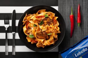 Makaron Lubella gotuj 8 minut. Wymieszaj go z przygotowanym sosem. Gotowe danie posyp oregano oraz parmezanem.