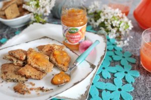 Chrupkie pieczywo na bazie migdałów i ziaren z dżemem brzoskwiniowym z lawendową nutą