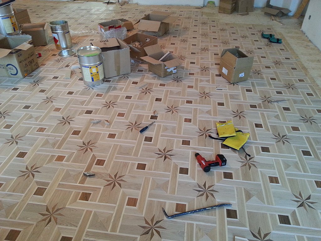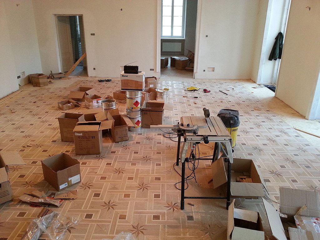 – Wchodząc do obiektu zastaliśmy ślepą podłogę z deski sosnowej, w części starą i z fragmentami położonymi na nowo – mówi Andrzej Adamiec, mistrz parkieciarski, właściciel firmy Parkiet Serwis specjalizującej się w układaniu parkietów tradycyjnych. – Najpierw położyliśmy płytę OSB i przykręciliśmy ją do ślepej podłogi. Płyta była szlifowana, a ponieważ użyliśmy kleju UZIN MK 73 nie wymagała gruntowania – dodaje. Produkt ten może być stosowany na wszystkich podłożach o dobrej wytrzymałości zarówno w budownictwie mieszkaniowym, jak i obiektach użyteczności publicznej. To gotowy do użycia tradycyjny klej jednoskładnikowy, który charakteryzuje się bardzo dobrymi parametrami podczas obróbki i idealnymi właściwościami po związaniu. UZIN MK 73 bardzo łatwo się rozprowadza, jest dobrze wypełniający i szybkowiążący. Umożliwia bardzo szerokie zastosowanie. Doskonale nadaje się do mozaiki parkietowej, parkietu tradycyjnego, lamelowego i parkietu gotowego.