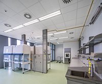Projekt budynku stworzył Warsztat Architektury Pracownia Autorska Krzysztofa Kozłowskiego w Sopocie. Projektanci postawili tu na nowoczesną konstrukcję i najwyższej jakości materiały. Laboratoria to bardzo wymagające wnętrza, dlatego też ich twórcy sięgają po sprawdzone komponenty. Tym razem wykorzystano wykonany ze skalnej wełny mineralnej sufit podwieszany Rockfon® MediCare® Air. Zalety tego rozwiązania widoczne są gołym okiem. Powierzchnię płyt stanowi pomalowany na biało wodoodporny welon, co zapewnia estetyczny wygląd i gwarantuje łatwość czyszczenia. Tylna strona wykończona jest nieprzepuszczającą powietrze membraną. Krawędzie płyty są dodatkowo uszczelnione. To nie tylko rozwiązanie estetyczne, ale także praktyczne, ze względu na właściwości dźwiękochłonne (klasa A). Sufity MediCare Air spełniają rygorystyczne wymogi obiektów, w których niezbędna jest możliwość regulacji ciśnienia, w celu uniknięcia rozprzestrzeniania zakażeń. Dzięki wysoce skutecznej membranie znajdującej się z tyłu płyty, uszczelnionym krawędziom i klipsom MediCare Air zapewnia stopień szczelności, umożliwiając utrzymanie ciśnienia powietrza na określonym poziomie. Ponadto płyty są przebadane ze względu na odporność na mikroorganizmy (m.in. MARSA, Candida Albicans, Aspergillus Niger) i uzyskały klasę bakteriologiczną B5 i B10. Oznacza to, że spełniają wymagania dla obszarów bardzo wysokiego ryzyka, według definicji zawartej we francuskiej normie NF S 90-351 dla placówek służby zdrowia, a także rygorystyczne wymagania dotyczące czystości powietrza wg ISO.