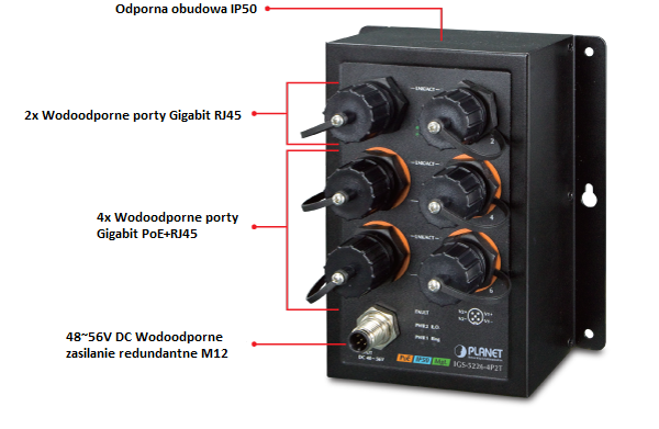 Wśród nowości jest switch przemysłowy o klasie szczelności IP50 – IGS-5226-4P2T, który cechuje się wysokim poziomem odporności na zakłócenia elektromagnetyczne i ciężkie przepięcia elektryczne. IGS-5226-4P2T wyposażony jest w 6-portów 10/100/1000BASE-T z funkcją autonegocjacji prędkości i złączami odpornymi na pył. Urządzenie zostało zaprojektowane z myślą o ciężkich warunkach środowiska, gdyż jego wytrzymałość pozwala na pracę w zakresie temperatur od -40 do +75 stopni C.