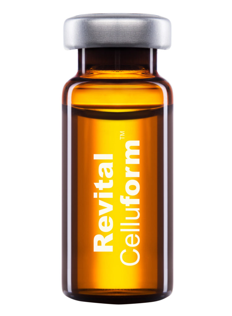 Revital Celluform to mezokoktajl do zabiegów mezoterapii, które wykonywane są w profesjonalnych gabinetach wyłącznie przez lekarzy. Jest bogaty w dobroczynne substancje aktywne, pobudzające przemianę materii, przyspieszające rozkładanie tłuszczu w komórkach, poprawiające krążenie oraz napięcie skóry. Wyciąg z soi, bogaty w lecytynę, to naturalna, całkowicie bezpieczna i dobrze tolerowana przez organizm substancja. Pomaga w sposób naturalny eliminować i przekształcać tłuszcz w energię. Natomiast witamina PP (nicotinamide) obniża poziom cholesterolu, rozszerza naczynia krwionośne (może powodować zaczerwienienia i uderzenia gorąca) i podwyższa ciśnienie tętnicze. To wszystko skutkuje redukcją cellulitu, a także wpływa na lepszy wygląd skóry, która staje się aksamitnie gładka i lepiej dotleniona.